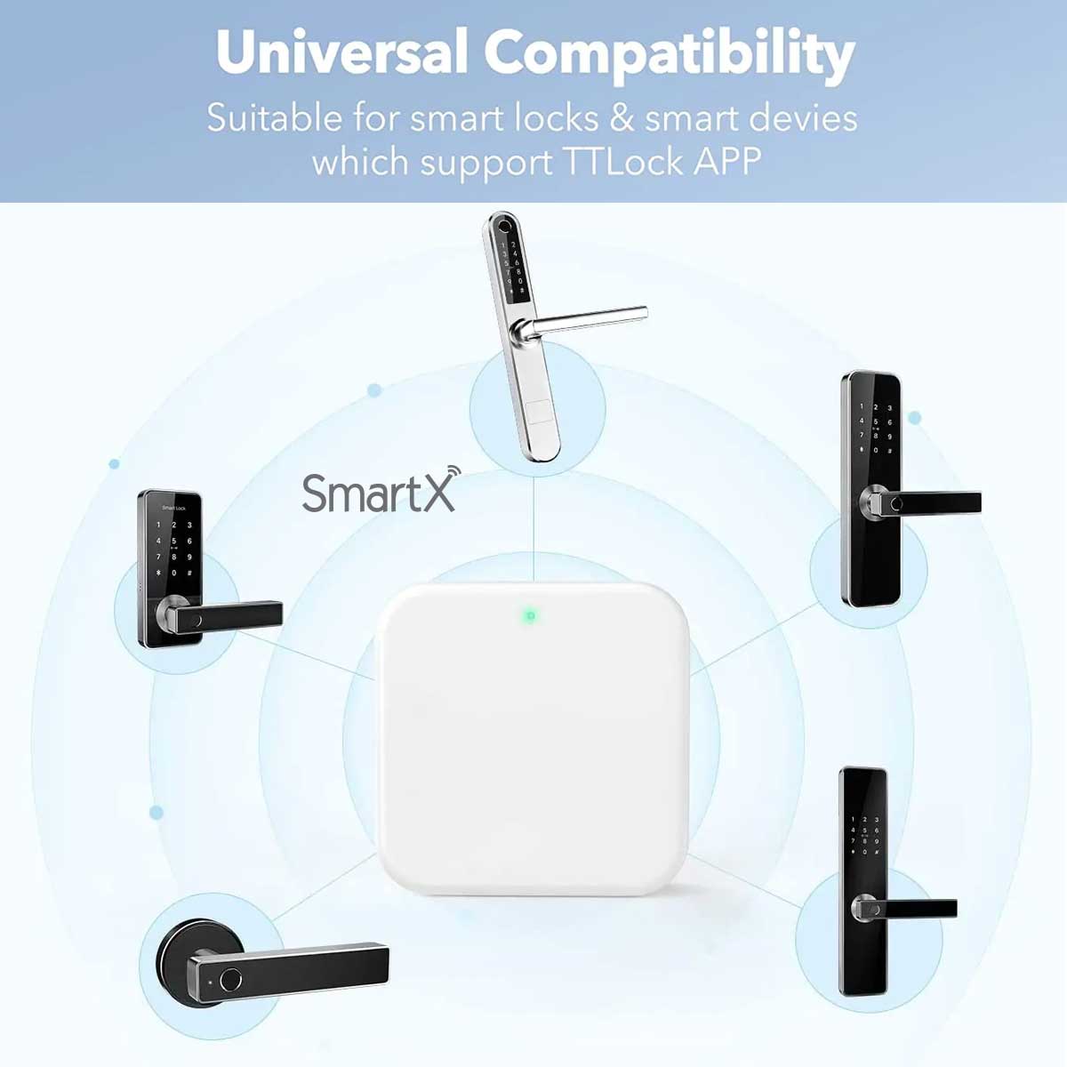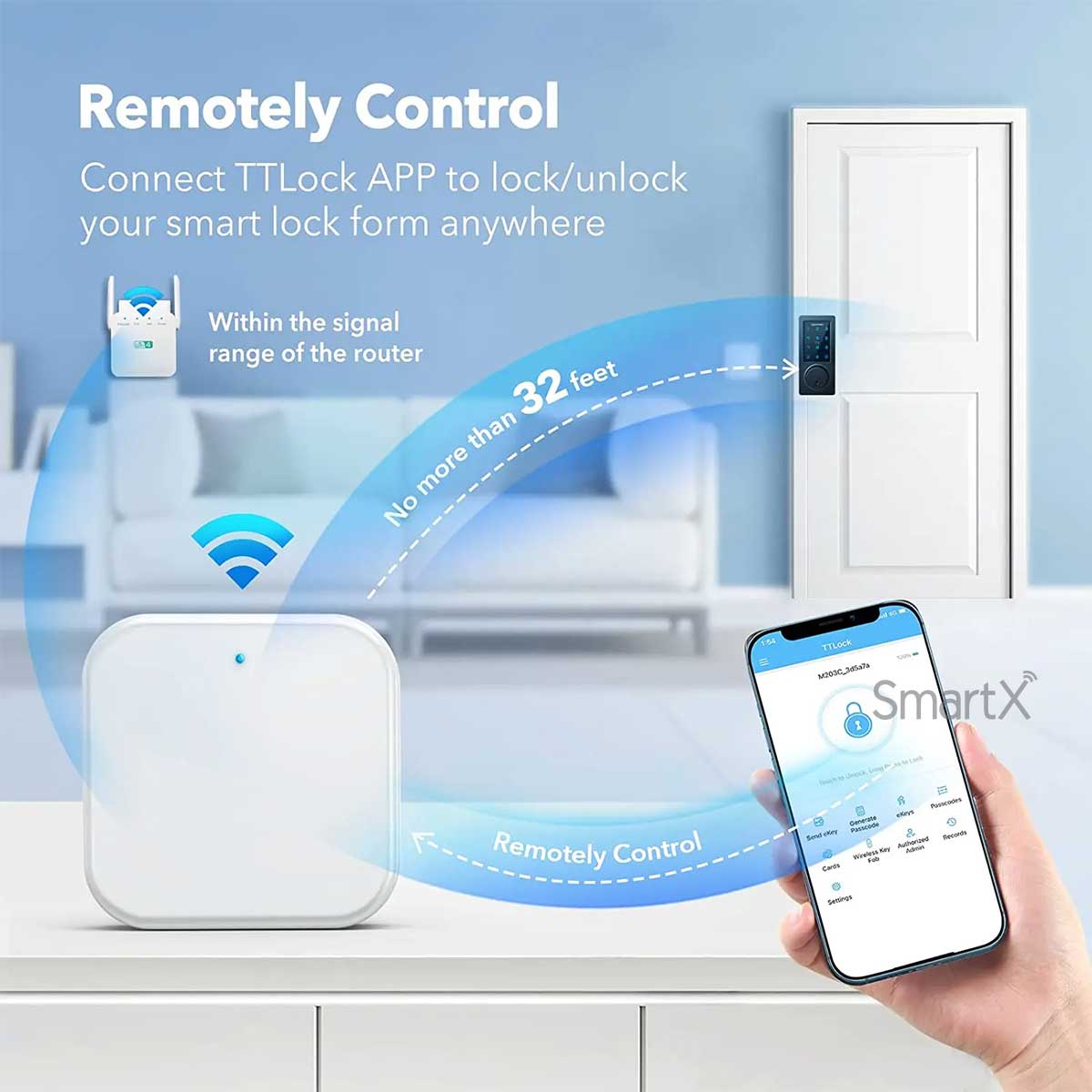 This gateway connects your Bluetooth smart door lock to your home Wi-Fi network, allowing remote control and management from anywhere through the TTLock or Sciener smartphone app.